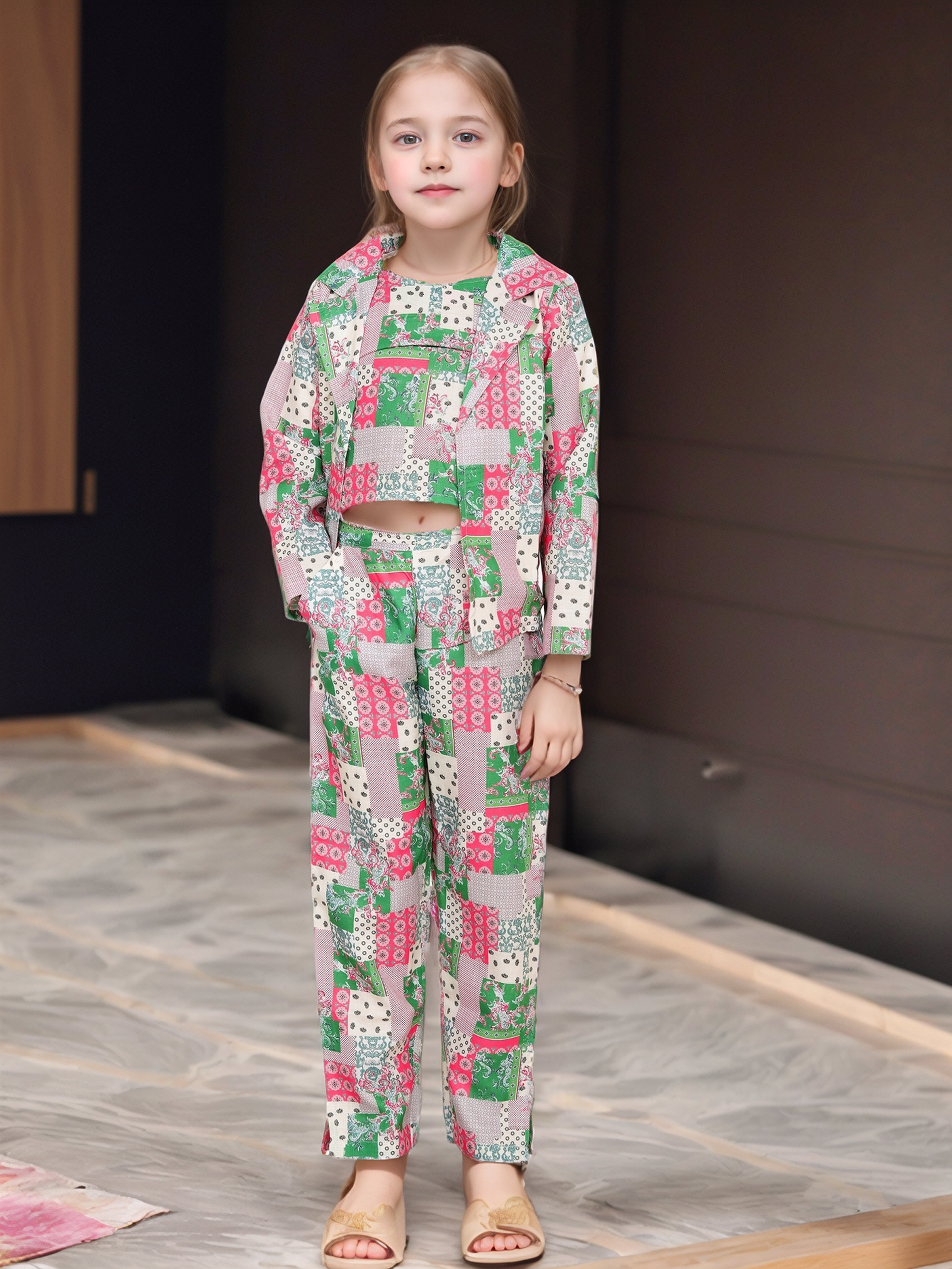 Let your little fashionista make a bold statement with this vibrant patchwork print 3-piece co-ord set. Featuring a stylish crop top, high-waisted pants, and a matching blazer-style jacket, this set is perfect for any occasion. The eye-catching mix of pink, green, and white prints adds a playful yet trendy touch, making it ideal for casual outings, parties, and festive events. Crafted from soft, breathable fabric, this outfit ensures maximum comfort and style all day long.