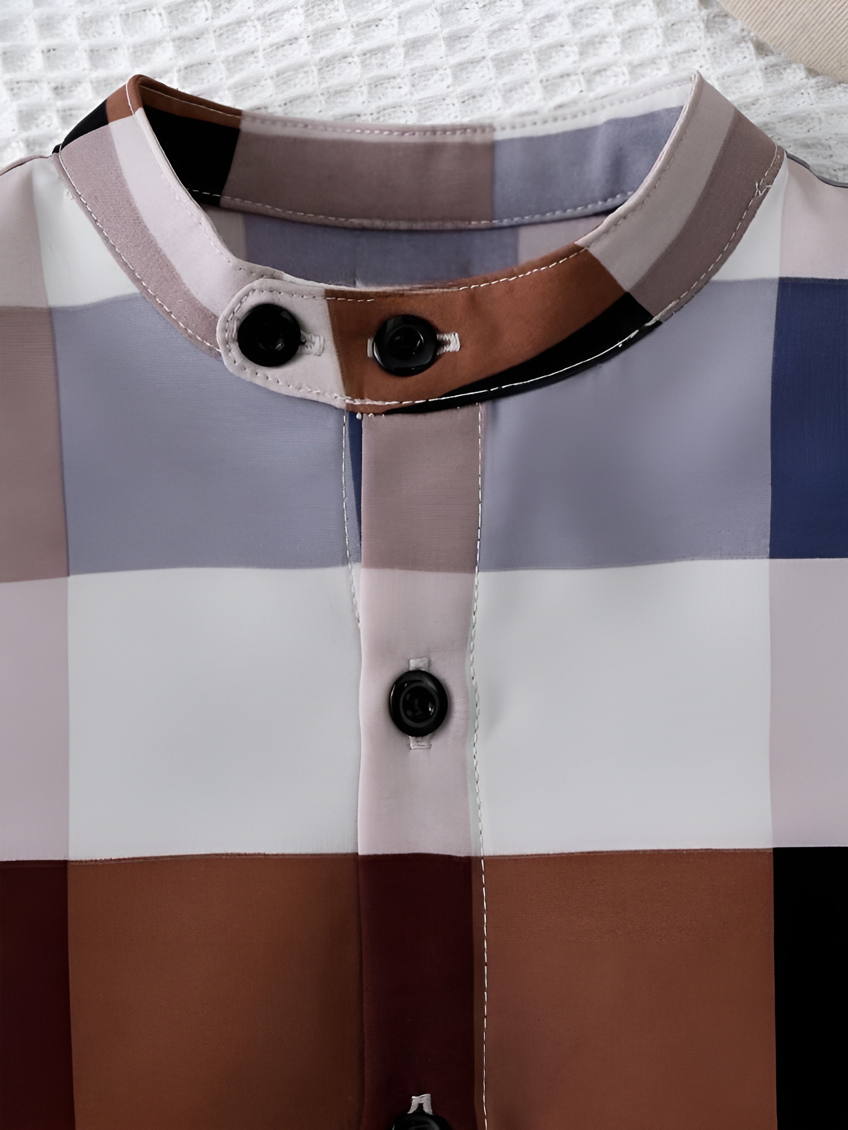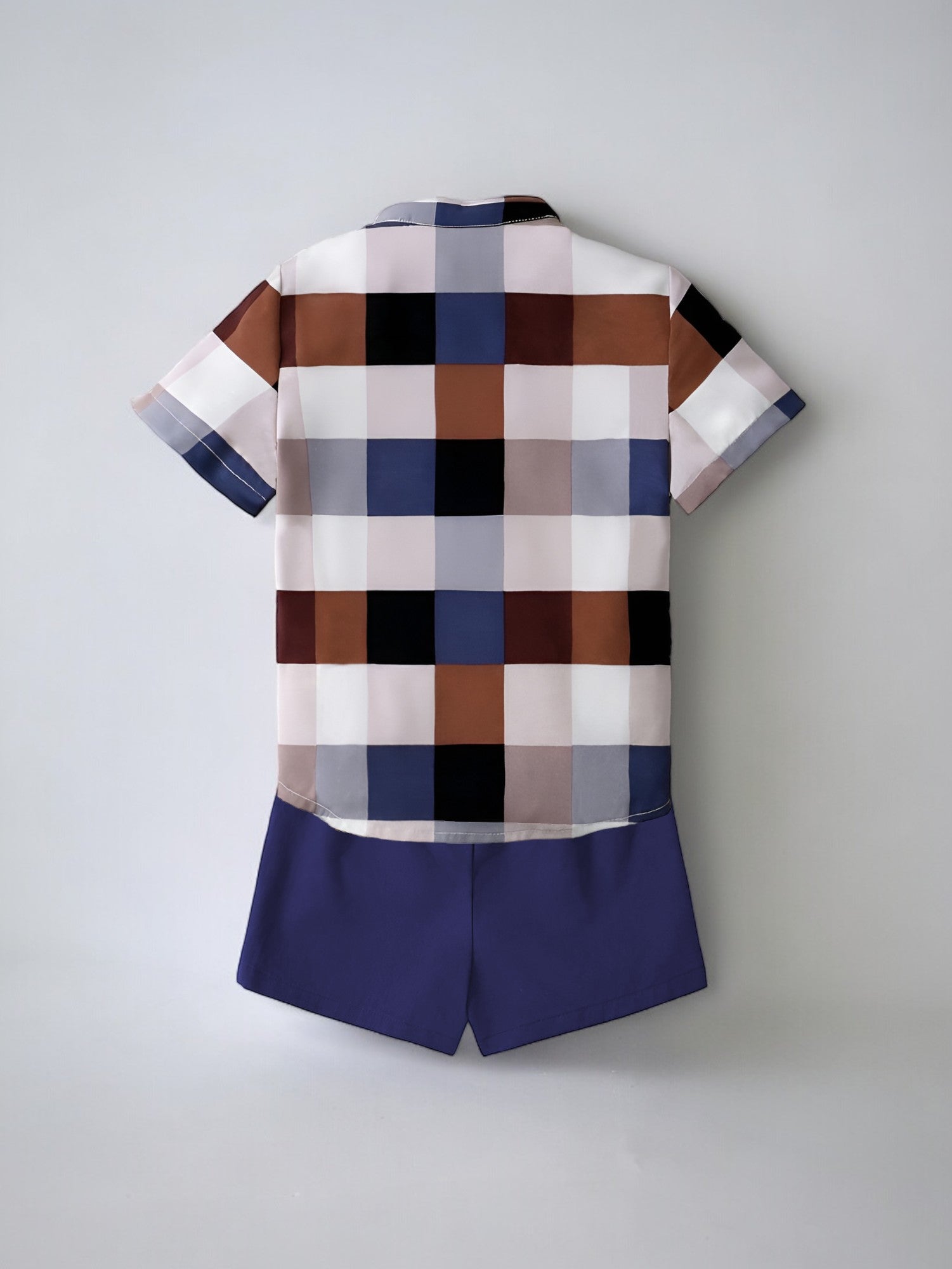 Add a touch of style to your little one's wardrobe with this classic boys' outfit set. Featuring a short-sleeve button-down shirt in a bold multicolor plaid pattern and comfortable Navy Blue  shorts with an elastic waistband, this ensemble combines both fashion and ease. Perfect for casual outings or special occasions, this set offers a sharp and trendy look for boys. Available in multiple sizes at Shinydots.
