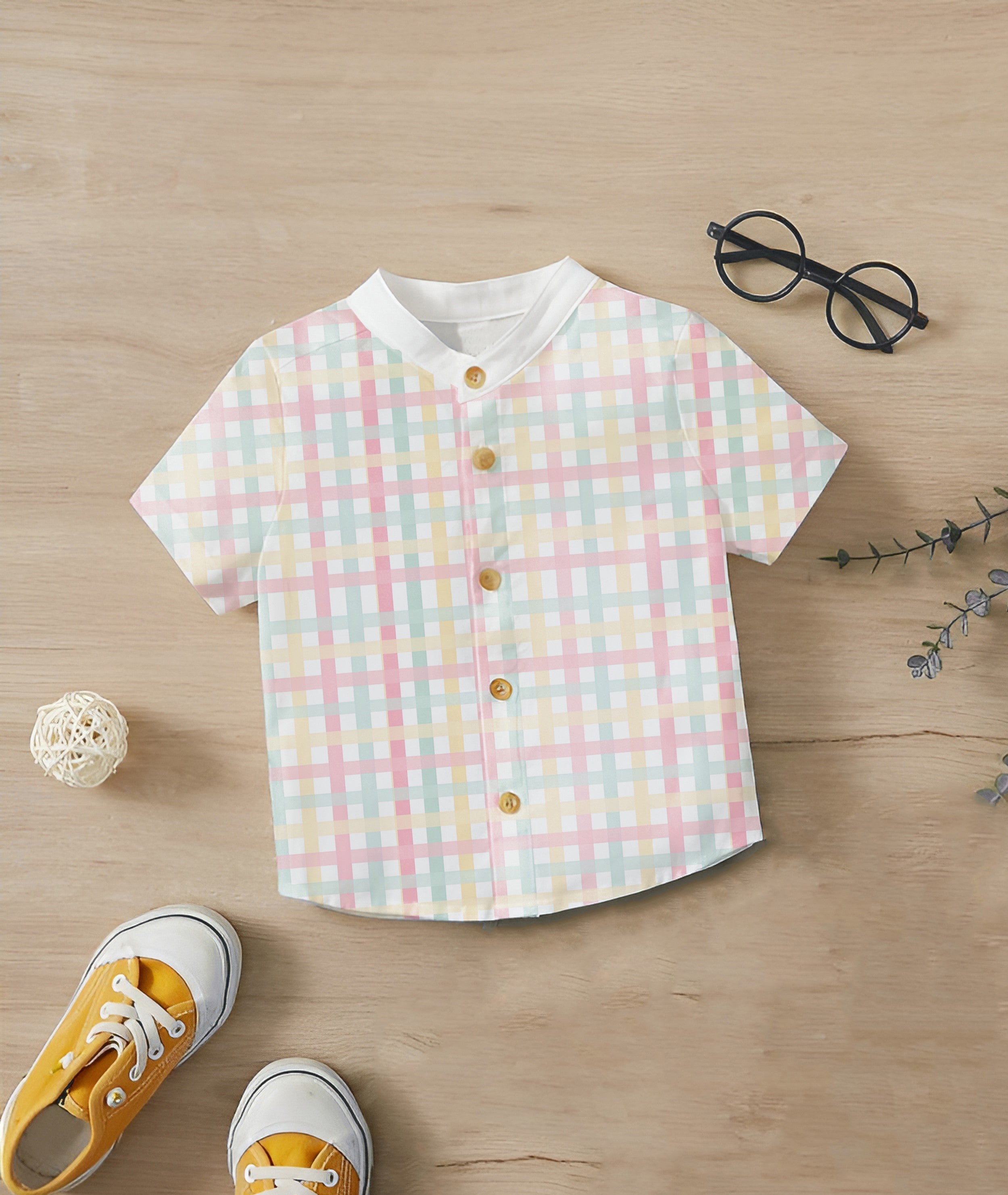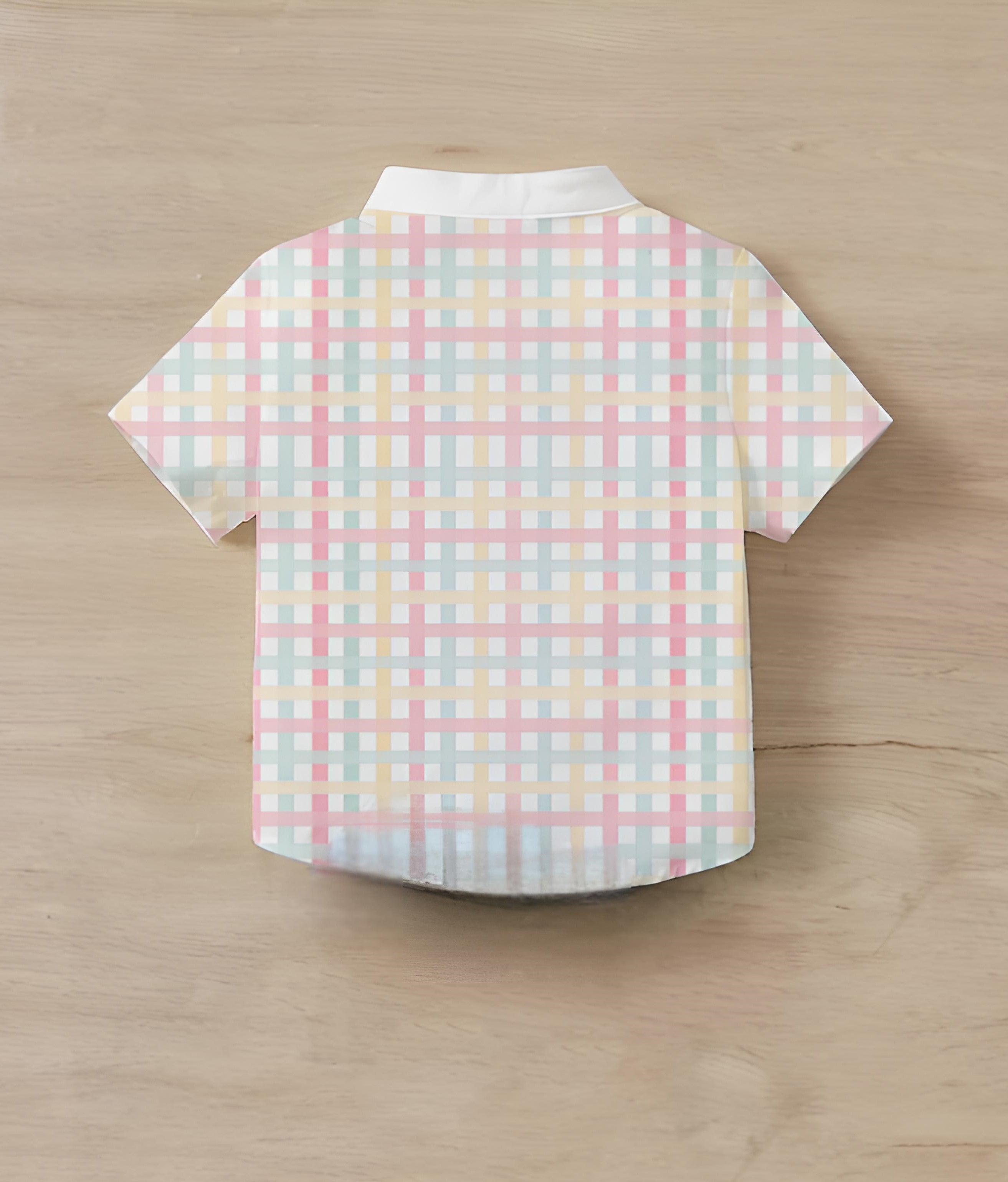Add a dash of style to your little one’s wardrobe with this adorable pastel checkered short-sleeve shirt. Featuring a modern mandarin collar and soft, breathable fabric, it’s perfect for casual outings and special occasions.