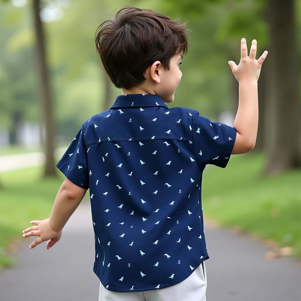 Navy Blue Kids' Short-Sleeve Dianosaur Printed Shirt - Stylish & Comfortable
