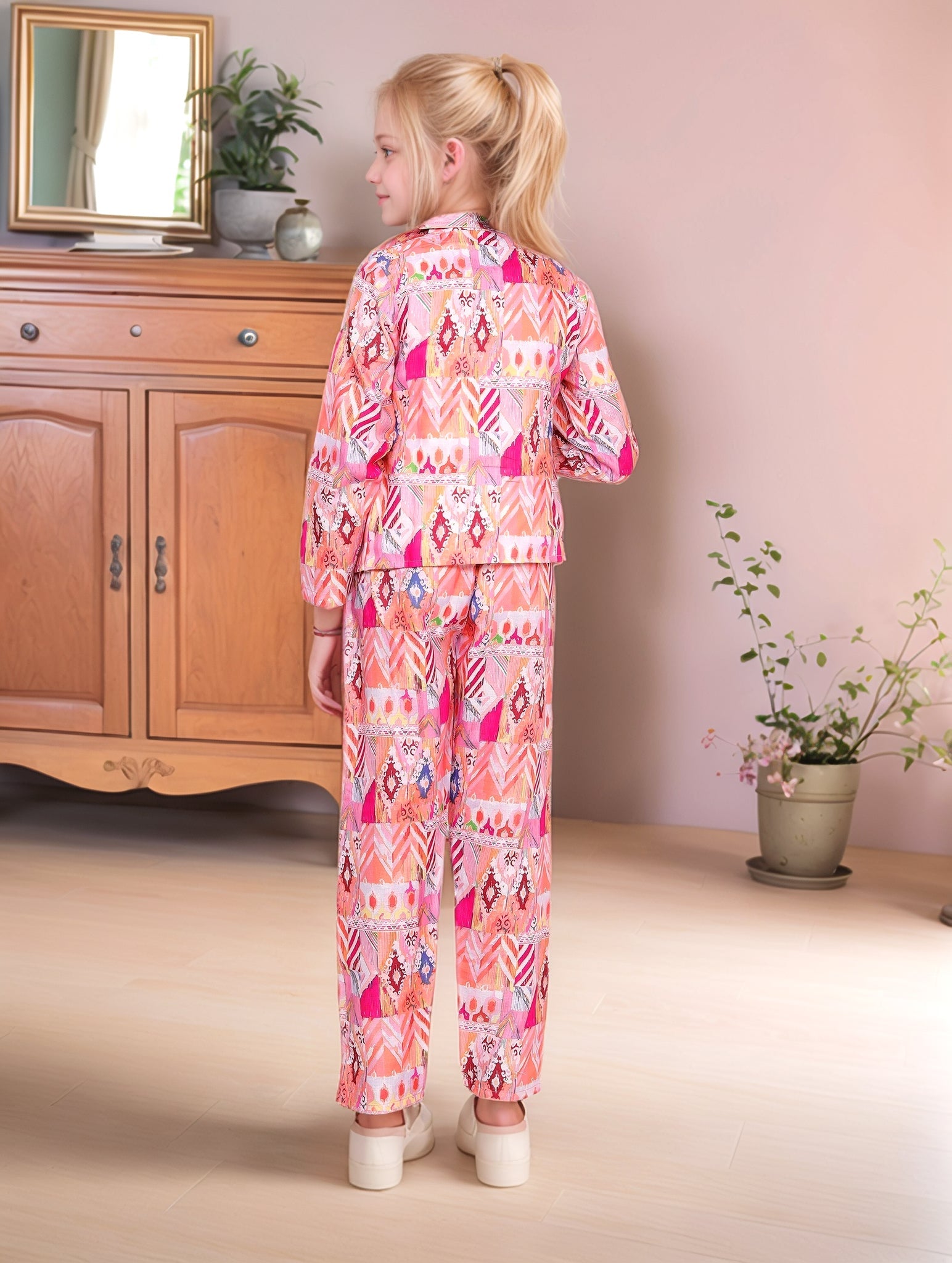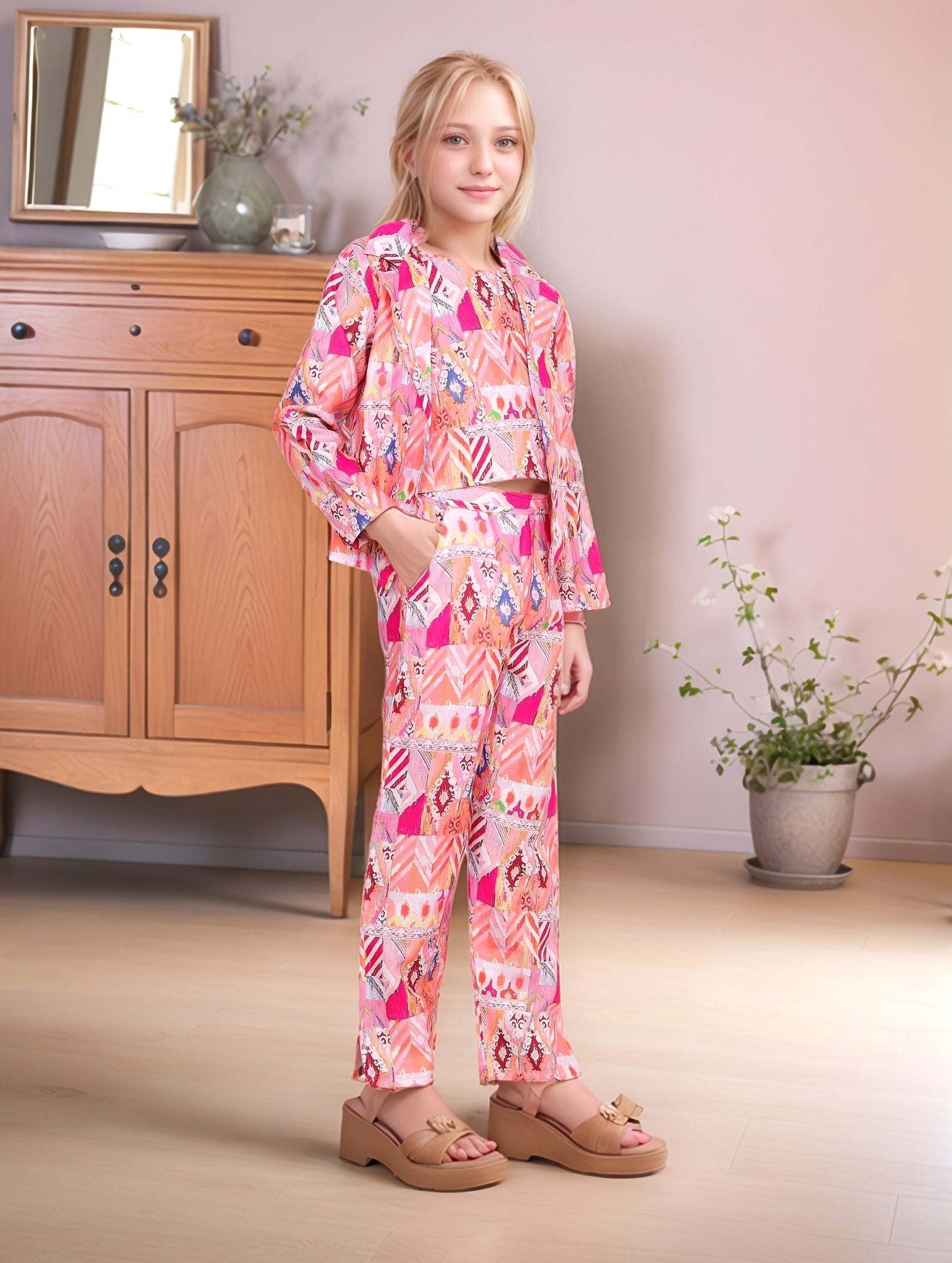 Pink-Orange Cotton Blend Digital Print Blazer, Tunic Palazzo 3-Piece Co-Ord Set For Girls