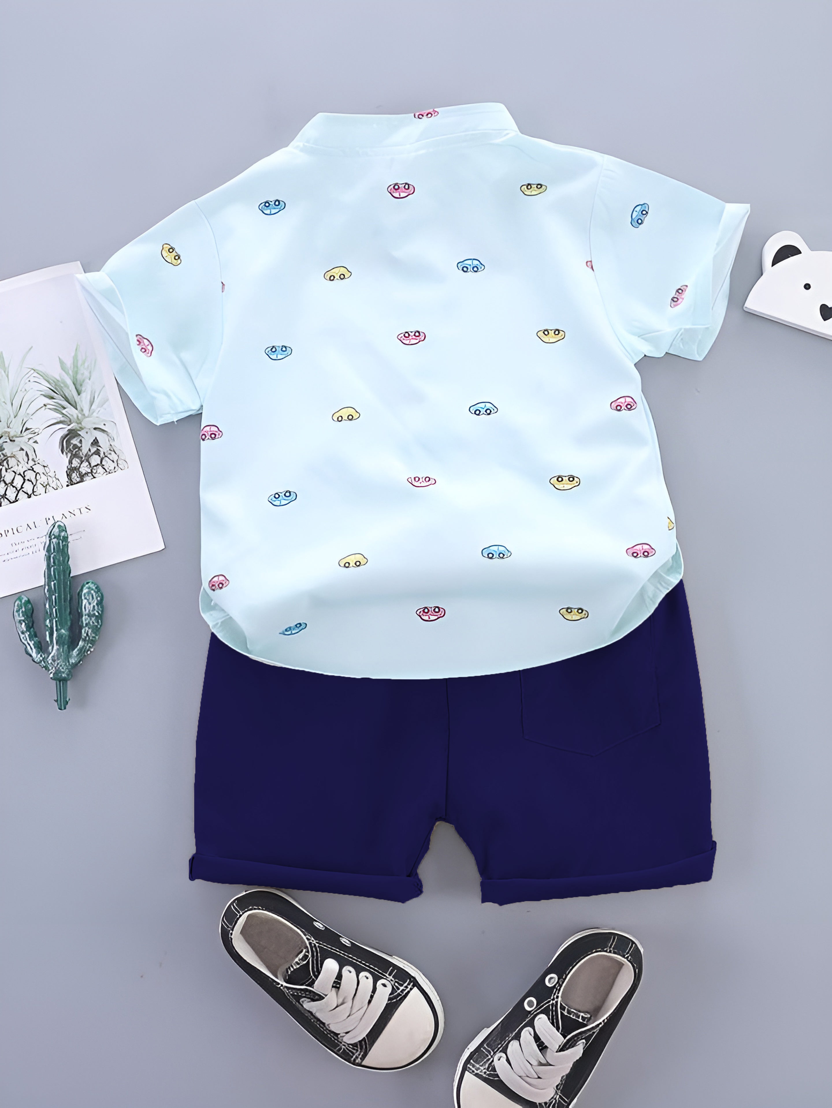 Shinydots Baby Boy Skyblue Car Print Short Sleeve Shirt & Shorts Two Piece Set