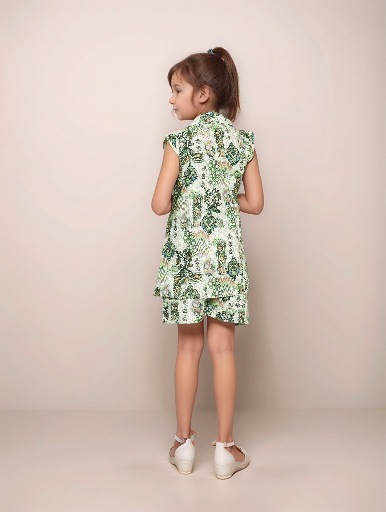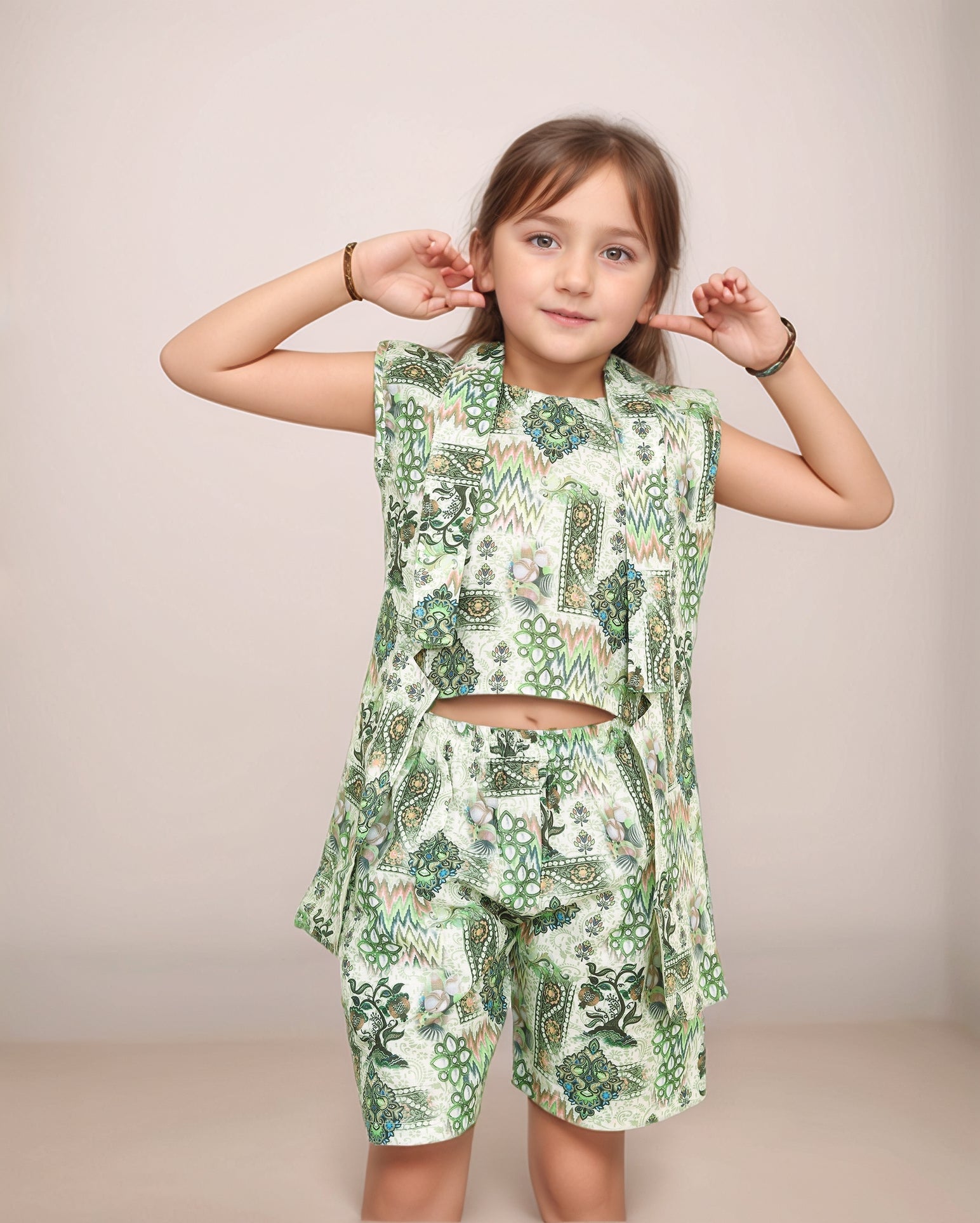 Shinydots Elegant Green Abstrect Design High Low 3-Piece Co-Ord Set Blazer, Crop Top & Shorts