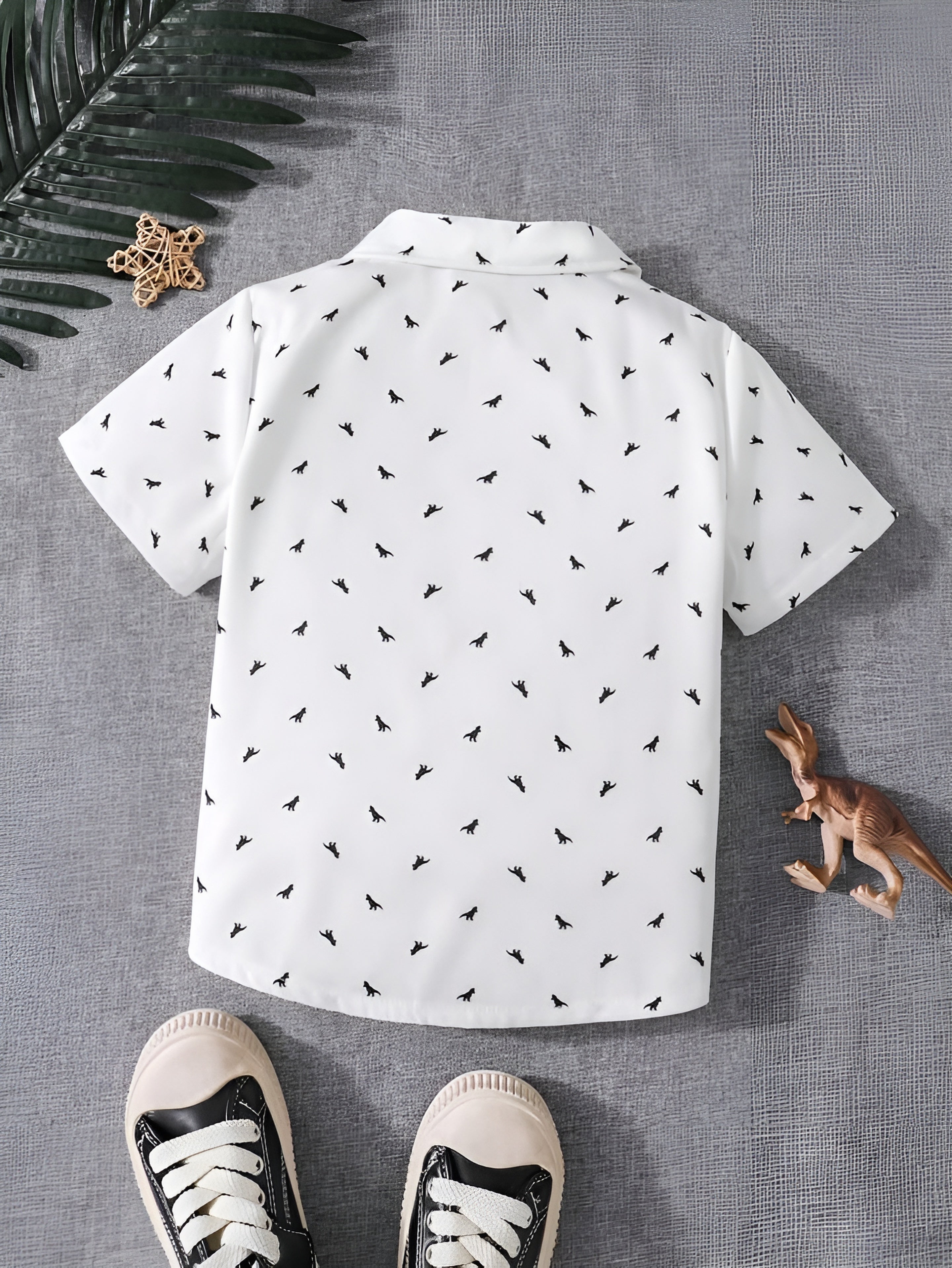 White Kids' Short-Sleeve Printed Shirt with Black Dino Patterns - Stylish & Comfortable